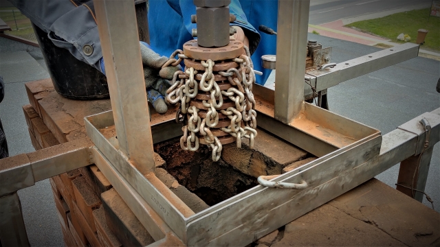 1. Szlamowanie komina to czyszczenie kominy mechanicznie, łańcuchowo (frezem) do lica cegły (moc jest dostosowana do każdego rodzaju komina). Szlamowanie odbywa się za pomocą specjalnych mas odpornych na ścieranie, kruszenie i temperaturę w zakresie 1000°C-1300°C.